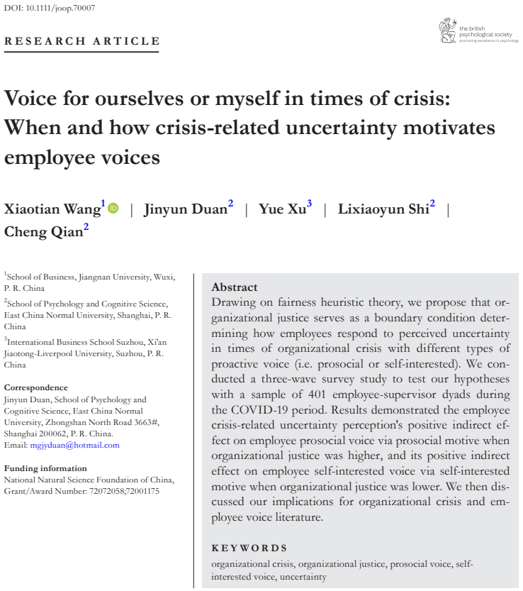 近期,国际权威期刊《Journal of Occupational and Organizational Psychology》正式刊发了我院王啸天老师作为第一作者与合作者共同完成的论文“Voice for ourselves or myself in times of crisis: When and how crisis-related uncertainty motivates employee voices”。该研究深入探讨了员工如何通过建言行为应对组织危机,为组织危机...