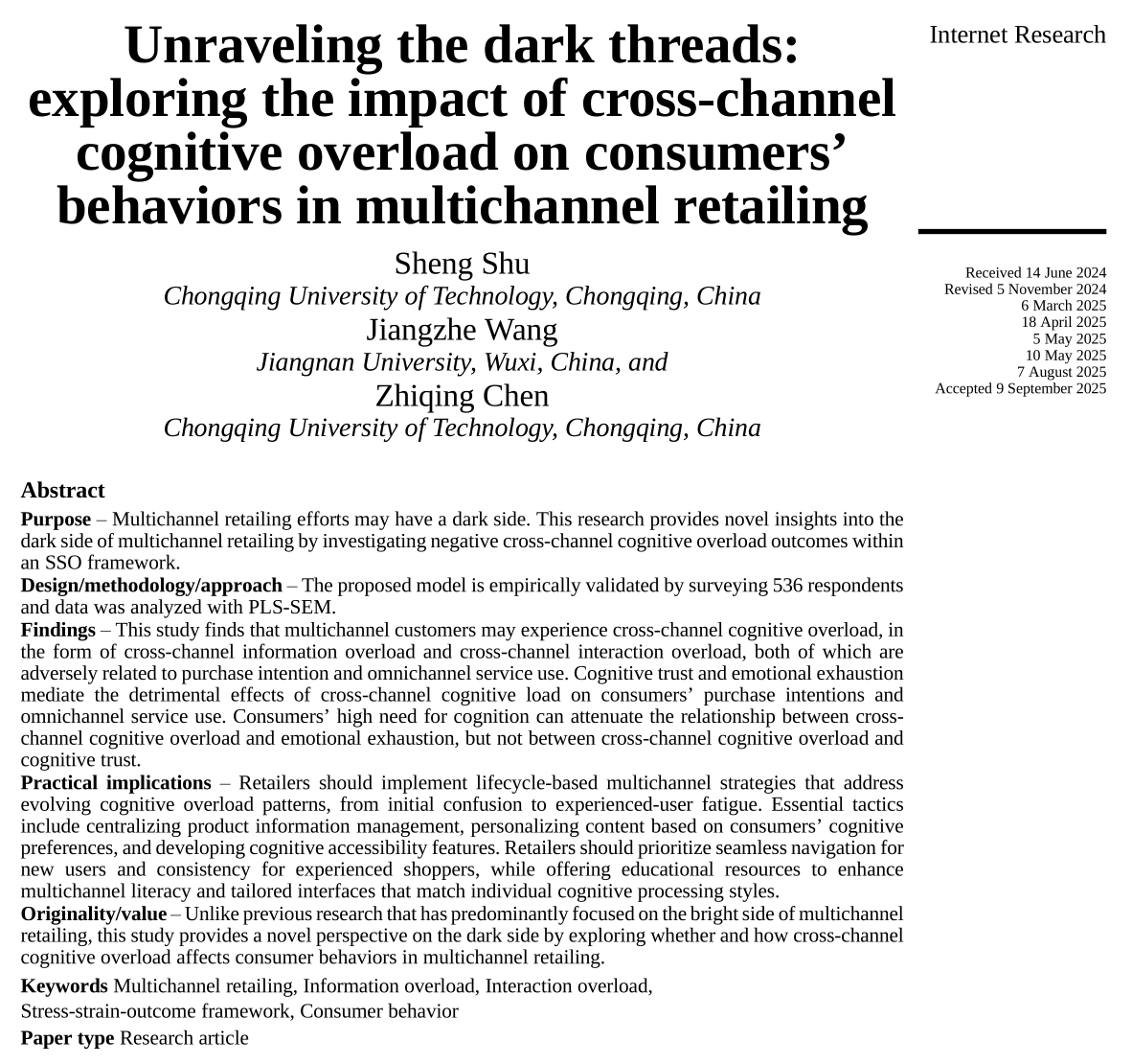 近日,江南大学商学院青年教师王江哲作为通讯作者,在国际权威期刊《Internet Research》发表了题目为“Unraveling the dark threads: exploring the impact of cross-channel cognitive overload on consumers' behaviors in multichannel retailing”的学术研究成果。《Internet Research》在全球ABS管理学期刊分类中评定为3星,是...