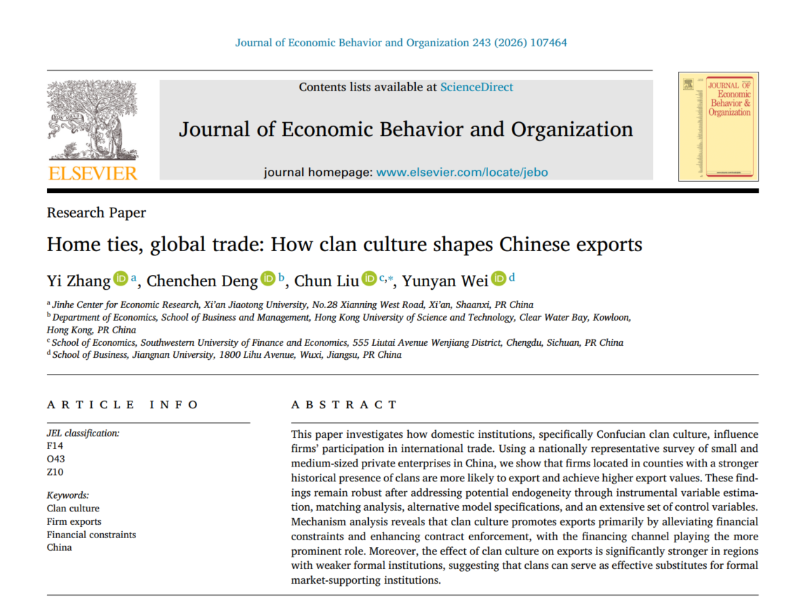近日,商学院魏昀妍副教授与西安交通大学张一教授、香港科技大学博士生邓晨晨、西南财经大学柳春博士共同完成的论文“Home ties, global trade: How clan culture shapes Chinese exports”在《Journal of Economic Behavior & Organization》(JEBO)正式发表。JEBO在ABS管理学期刊中评定为3星,是行为经济学与制度经济学领域公认的国际权威期刊。本次论文发表实现了江南大学商学院在该期刊...