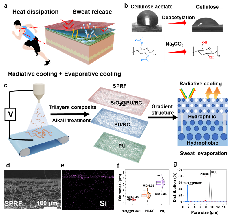 在开发下一代高性能织物时,热管理和水分传递对人体舒适度至关重要。然而,大多数柔性辐射制冷材料依赖于均匀或随机多孔结构,无法精确响应整个太阳光谱,这限制了其优化冷却效果的能力。为了在紫外-可见光区(UV-Vis)和近红外区(NIR)实现精确散射,调控多孔结构的直径以与太阳辐射波段重叠是提高太阳辐射反射率的必要条件。疏水聚合物热管理材料忽视了人体的湿舒适性,导致冷却效率降低。在辐射冷却材料上建立长期稳定的Janus排汗结构对于高效且持久的身体热管理至关重要。江南大学纺织科学与工程学...