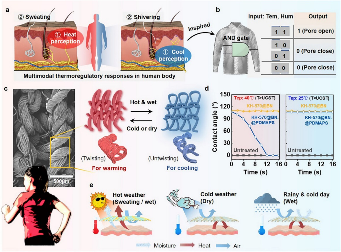 在日常生活中,我们常常面临这样的困扰:炎热夏日衣物闷热黏腻,寒冷或潮湿天气又易湿冷难耐。传统纺织品多依赖被动的隔热或吸湿功能,难以像人体皮肤那样主动感知环境与身体状态并进行动态调节。那么,能否创造出一种“聪明”的织物,在不同气候与生理条件下自动调节温湿,实现真正的“全天候舒适”?近日,江南大学纺织科学与工程学院孙丰鑫研究团队提出了一种基于结构–材料协同设计的分级结构逻辑门控智能纺织品。该织物通过逻辑计算整合水分触发的孔径开关与温度依赖的梯度润湿调控,能够同时响应环境温度与人体出...