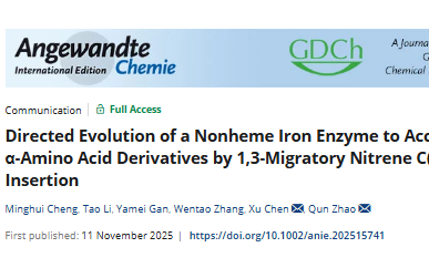 近期,我校生物工程学院赵群教授团队成功将非天然的氮宾迁移反应机制引入金属酶催化体系,实现了酶促法合成手性非天然氨基酸,研究成果以“Directed Evolution of a Nonheme Iron Enzyme to Access Chiral α-Amino Acid Derivatives by 1,3-Migratory Nitrene C(sp3)─H Insertion”为题正式发表于Angewandte Chemie International Edition...