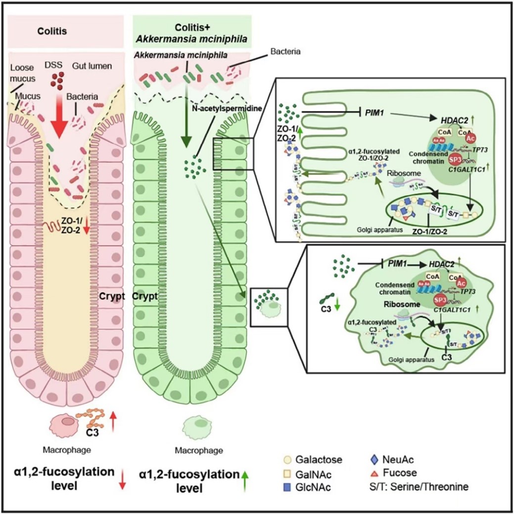 江南大学陆文伟教授团队的最新研究表明,肠道里的“有益菌”嗜黏蛋白阿克曼菌(A. muciniphila)及其产生的关键代谢物N-乙酰亚精胺能够增强肠道上皮细胞的α1,2-岩藻糖基化过程,为肠道构建了更坚固的“保护屏障”。该研究不仅明确了A. muciniphila代谢物对肠道糖基化的调控作用,更为炎症性肠病的生物治疗提供了新的思路,对推动通过肠道菌群维护人体肠道健康具有重要意义。相关研究成果以“Akkermansia muciniphila-Derived N-Acetylsp...