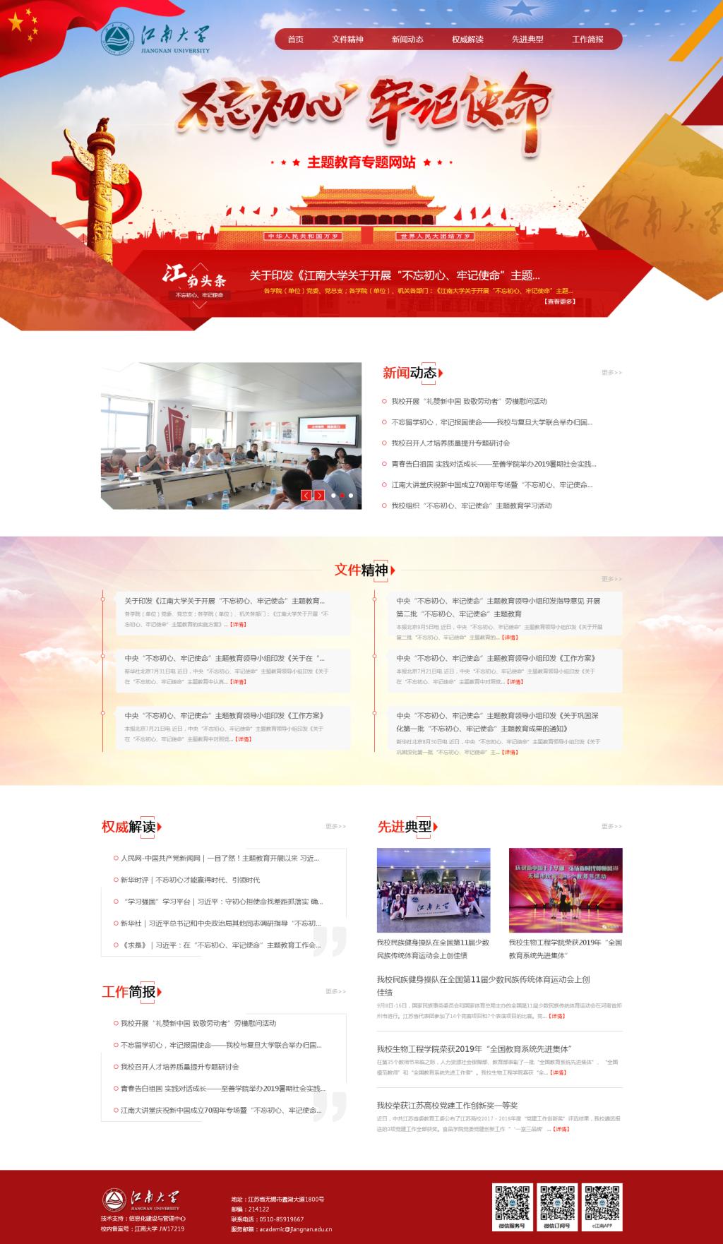 9月12日下午,我校在图书馆五楼报告厅召开“不忘初心、牢记使命”主题教育动员部署会,随后,各类主题教育活动在全校范围有序展开。为深入学习宣传习近平总书记关于主题教育的重要论述,深入宣传中央开展主题教育的重要精神,及时发布学校主题教育进展成效,校党委宣传部制作了“不忘初心、牢记使命”主题教育专题网站(http://jnbwcx.jiangnan.edu.cn/),并于2019年9月25日正式上线。专题网站开设了“新闻动态”“文件精神...