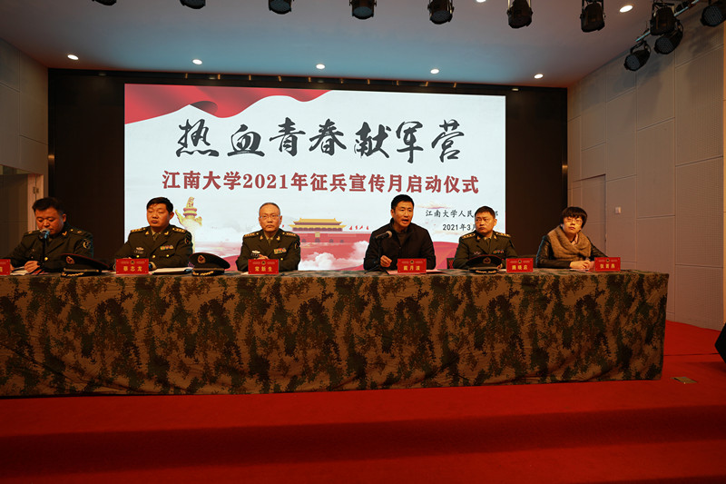 3月12日,江南大学2021年征兵宣传月启动仪式在大学生活动中心举行。无锡军分区政委常新生大校、校党委副书记戴月波、军分区蔡志龙处长、滨湖区人民武装部部长滕晓启、人民武装部部长张菁燕出席活动,校国防领导小组成员、各学院党委副书记、辅导员、部分学生代表参加活动,本次活动由人民武装部、学生工作部副部长汪双喜主持。会前,戴月波热情迎接了常新生一行,向其介绍江南大学校园征兵工作基本情况和典型做法,以及参军入伍...