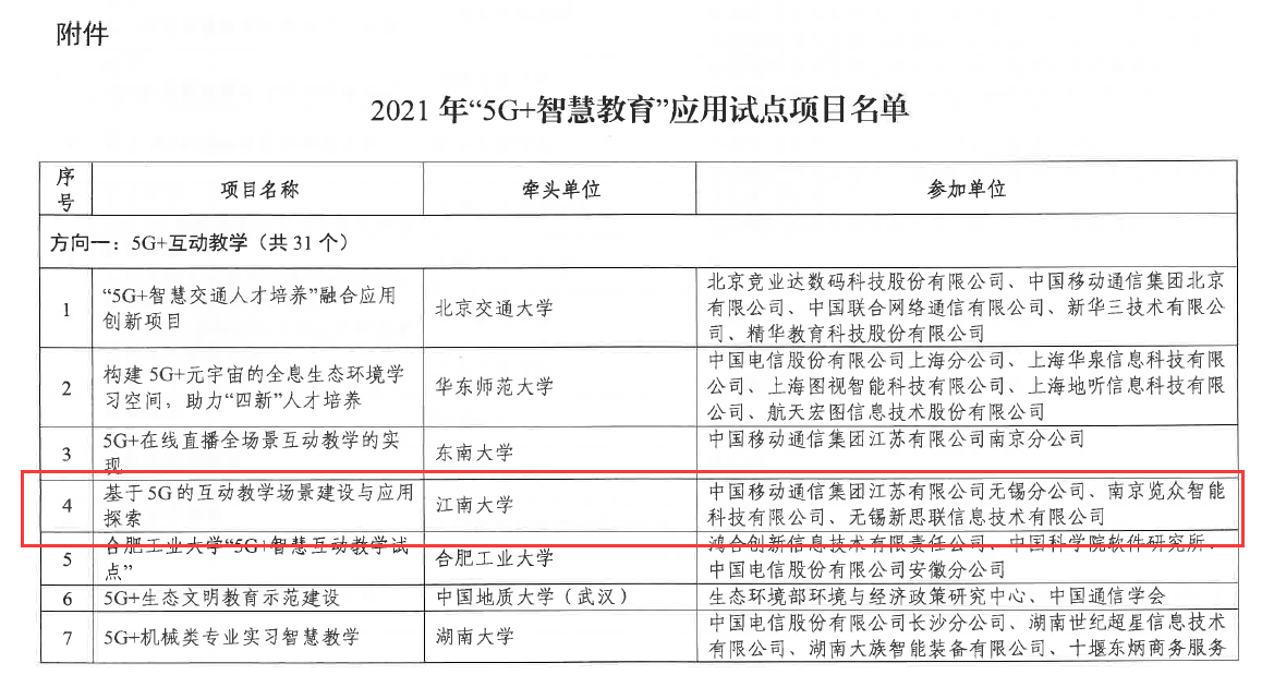 近日,工业和信息化部办公厅、教育部办公厅公布“5G+智慧教育”应用试点项目名单,江南大学组织申报的《基于5G的互动教学场景建设与应用探索》项目获2021年 “5G+互动教学” 试点方向项目立项。2021年9月,工信部、教育部联合组织开展“5G+智慧教育”应用试点项目申报工作,旨在遴选一批利用5G网络的教育信息化最佳实践和解决方案,培育一批以5G为代表的新一代信息通信技术与教育教学融合创新的典型应用,树立一批可复制推广、...