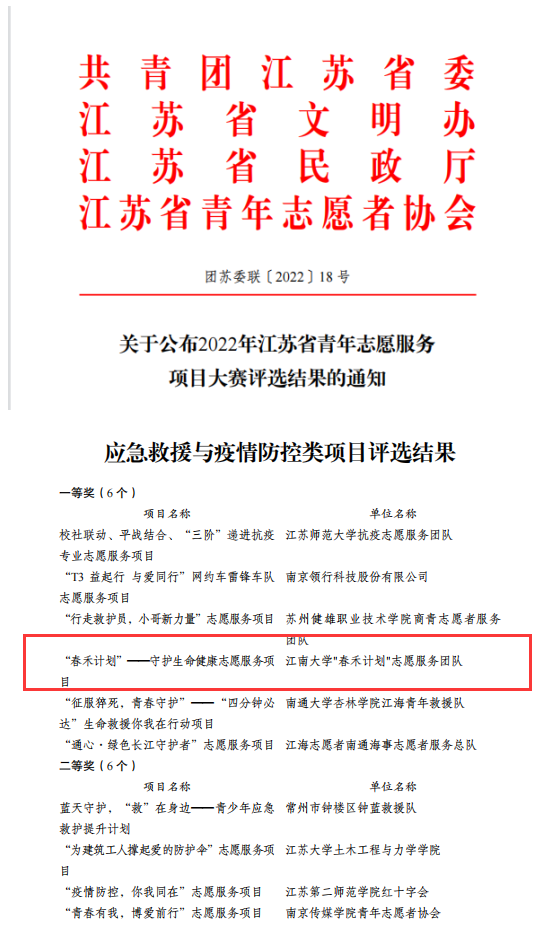 近日,由共青团江苏省委联合省文明办、省民政厅、省青年志愿者协会等单位共同开展的2022年江苏省青年志愿服务项目大赛暨第六届中国青年志愿服务项目大赛江苏省选拔赛结果揭晓,江南大学无锡医学院“春禾计划”志愿服务项目喜获一等奖荣誉。医学院“春禾计划”志愿服务项目围绕当前青少年急救知识普及率低,需求率高,生命保护意识不足的问题,依托医学专业特色,创新“生命+教育”“生命+体验”“生命+疫情”的“生命+”项...