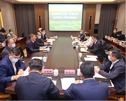 11月23日下午,黔东南州委常委、副州长崔鹏,从江县人大常委会主任欧仁文,从江县委常委、副县长钱吴永,黔东南州政府办公室、科技局、乡村振兴局、产业招商专班及从江县农业农村局、投资促进局等单位负责人一行来校调研对接定点帮扶合作。中国工程院院士、江南大学校长陈卫,校党委常委、副校长顾正彪,校长助理张光生,市校共建合作办公室、产业技术研究院、社会资源处及帮扶重点项目负责人等参加会议。顾正彪主持会议。陈卫...