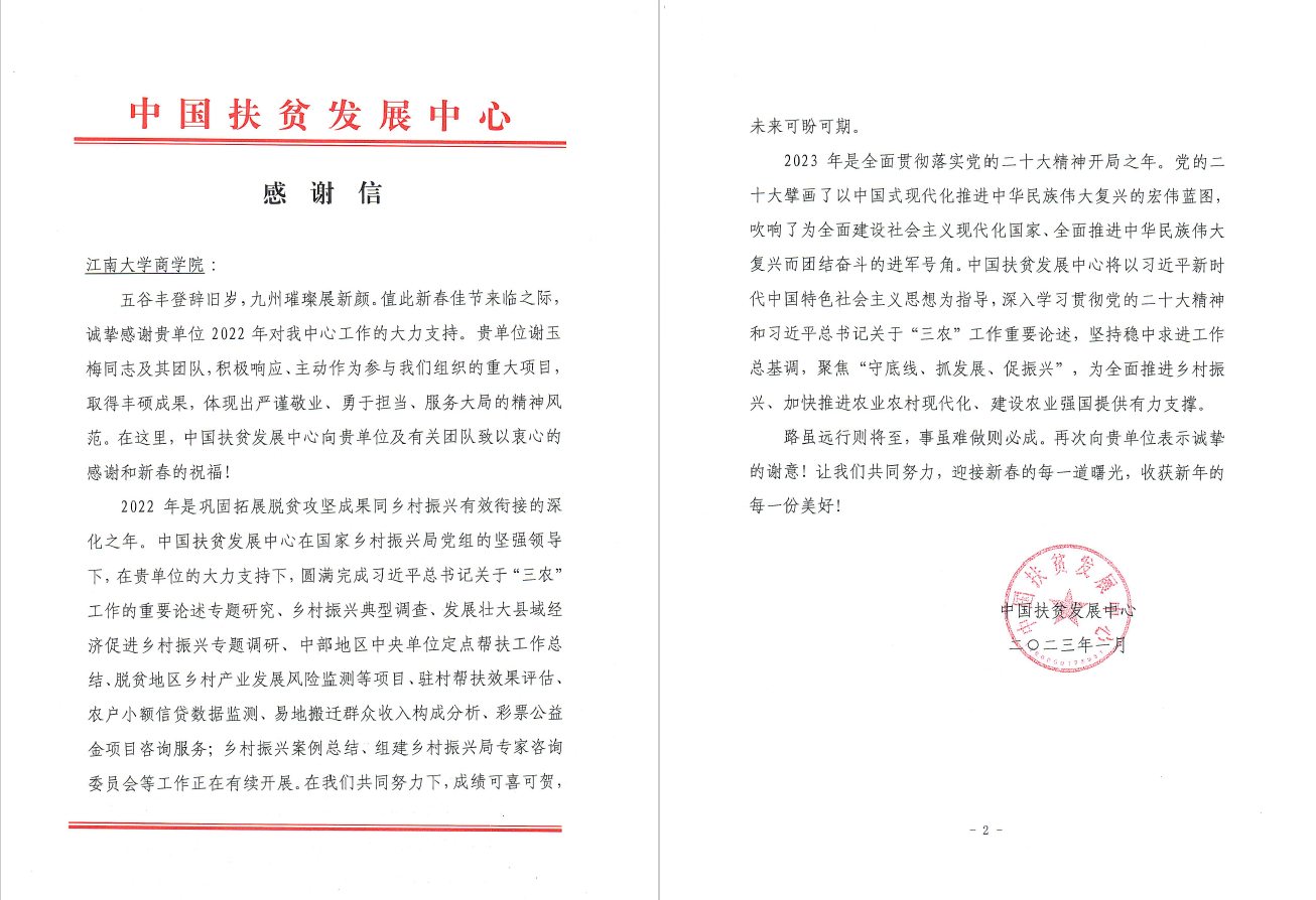 中国扶贫中心致专函感谢江南大学商学院谢玉梅同志及其团队,积极响应、主动作为参与中国扶贫中心组织的重大项目,取得丰硕成果,体现出严谨敬业、勇于担当、服务大局的精神风范。2022年7月至8月,谢玉梅同志及其团队赴广西凌云县和乐业县、重庆酉阳县和彭水县、贵州务川县和榕江县进行调研,针对国家乡村振兴局在我国160个国家级乡村振兴帮扶县开展的“富民贷”金融产品落实情况进行评估,结合2000户电话问卷及实地调研撰写了调...