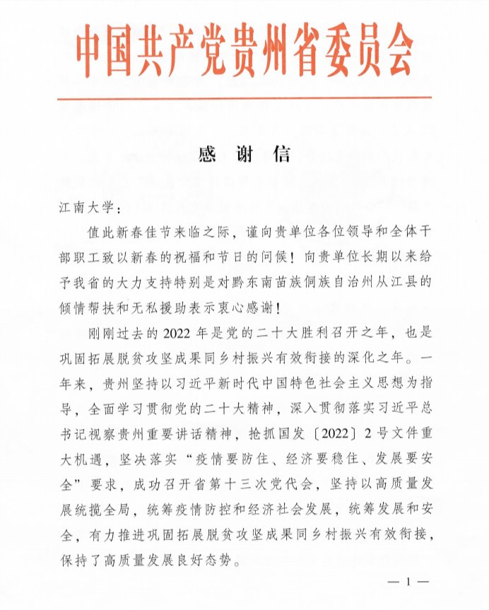 近日,贵州省委省政府向我校发来感谢信,对我校过去一年在从江县开展的定点帮扶工作予以高度肯定,并对学校长期以来给予贵州省的倾情帮扶和无私援助表示感谢。2022年,学校按照教育部和国家乡村振兴局关于巩固拓展教育脱贫攻坚成果同乡村振兴有效衔接的总体部署,根据《江南大学2022年定点帮扶工作要点》拟定的任务书、时间表和路线图,推动定点帮扶工作深入开展。在校领导高位谋划、率先垂范,承担定点帮扶任务的各相关单位、...