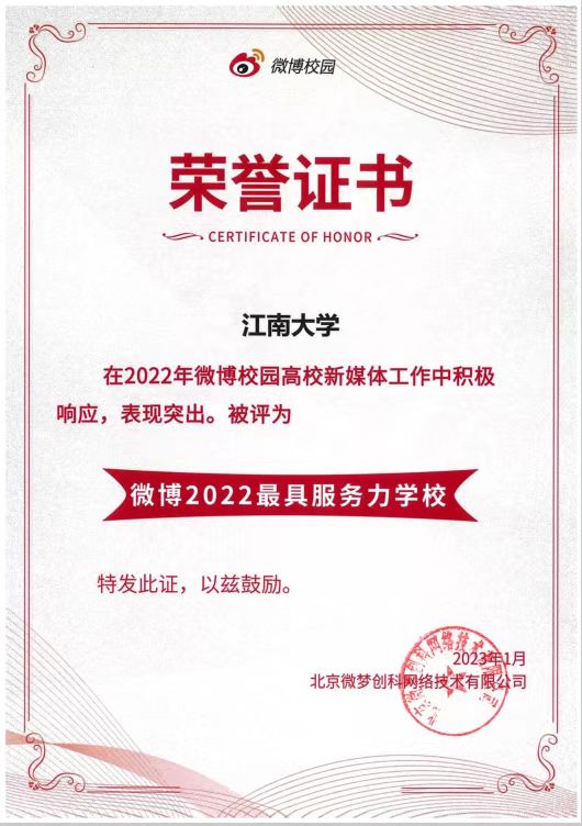 近日,江南大学融媒体中心捷报频传。“江南大学”百度百家号荣获2022年度“最具影响力高校新媒体”奖。该奖项由百度百家号设立,基于百度公司的分发技术和流量优势,从影响力、活跃度和互动度三个方面全方位衡量高校新媒体的综合影响力。在新出炉的新浪微博2022年度全国校园微盘点荣誉榜单上,我校荣获微博校园2022年度最具服务力高校奖项,党委宣传部张铁根老师荣获微博校园“2022优秀新媒体指导老师”称号。此次2022校园微盘...