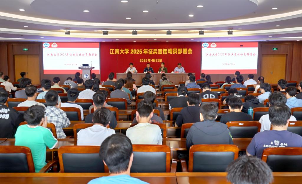 4月23日下午,2025年征兵宣传动员部署会在图书馆五楼报告厅举行。无锡军分区动员处上校处长韩延冬,滨湖区人武部上校政治委员唐振,江南大学人武部部长周伟涛出席会议,校国防教育工作领导小组成员单位的领导、各学院党委副书记、学工办主任、毕业班辅导员和学生代表参加会议。本次会议由江南大学人武部副部长俞立峰主持。会议在庄严的国歌声中拉开序幕。唐振、周伟涛为退役复学学生佩戴绶带并赠送书籍,表彰他们的奉献精神,勉...