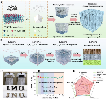 随着智能物联网设备和第五代移动通信技术的蓬勃发展,多频电磁干扰(EMI)及其相关电磁污染受到了广泛关注。传统的高导电性EMI屏蔽材料虽然能有效阻挡电磁波(EMW),但容易造成二次电磁污染。因此,开发具有高屏蔽效率和低反射系数(R)的EMI屏蔽材料仍是一个关键挑战。近年来,轻质、高孔隙率的气凝胶材料,被认为是解决高反射EMI屏蔽问题的理想方案。然而,传统的冷冻干燥工艺制备的气凝胶通常具有无序结构,其EMI屏蔽性能通...