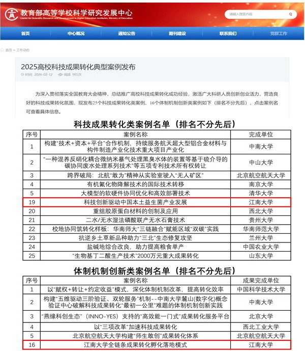近日,教育部高等学校科学研究发展中心正式发布2025年度高校科技成果转化典型案例名单,江南大学两项案例成功入选,分别获评科技成果转化类典型案例与体制机制创新类典型案例,江南大学成为同期为数不多、两项案例双双入选的高校。彰显了学校在服务国家创新驱动发展、推动新质生产力培育中的突出成效与示范担当。《科技创新驱动中国本土益生菌产业发展》入选科技成果转化类典型案例。食品学院益生菌与营养健康研究团队长期深耕基础研究与产业攻关,建成库容超20000株、行业领先的益生菌种质资源库,构建起系统...